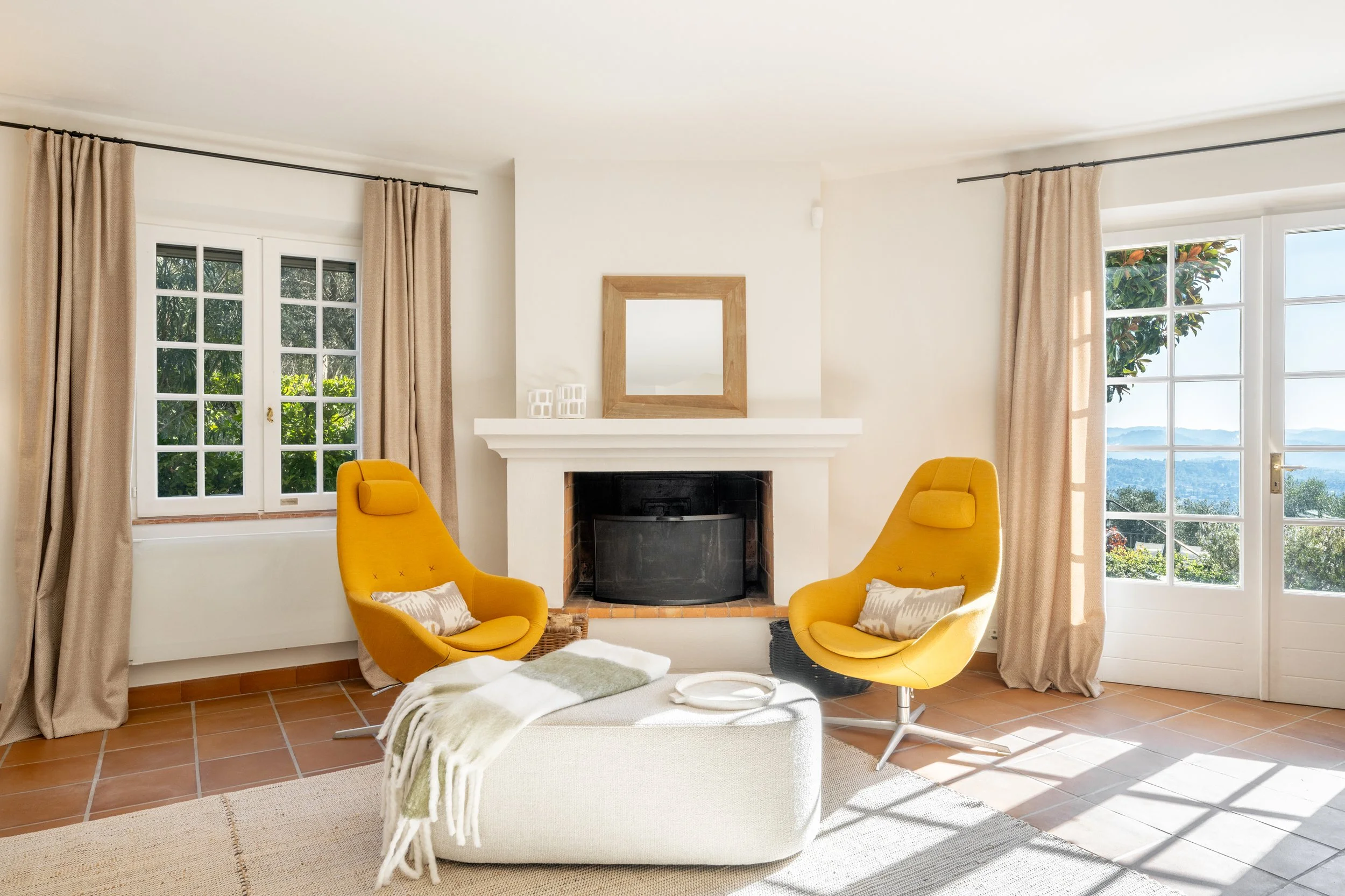Soft, chalky hues, sun-washed greens, and grounding neutrals create a quiet dialogue with the landscape, blurring the line between indoors and out.